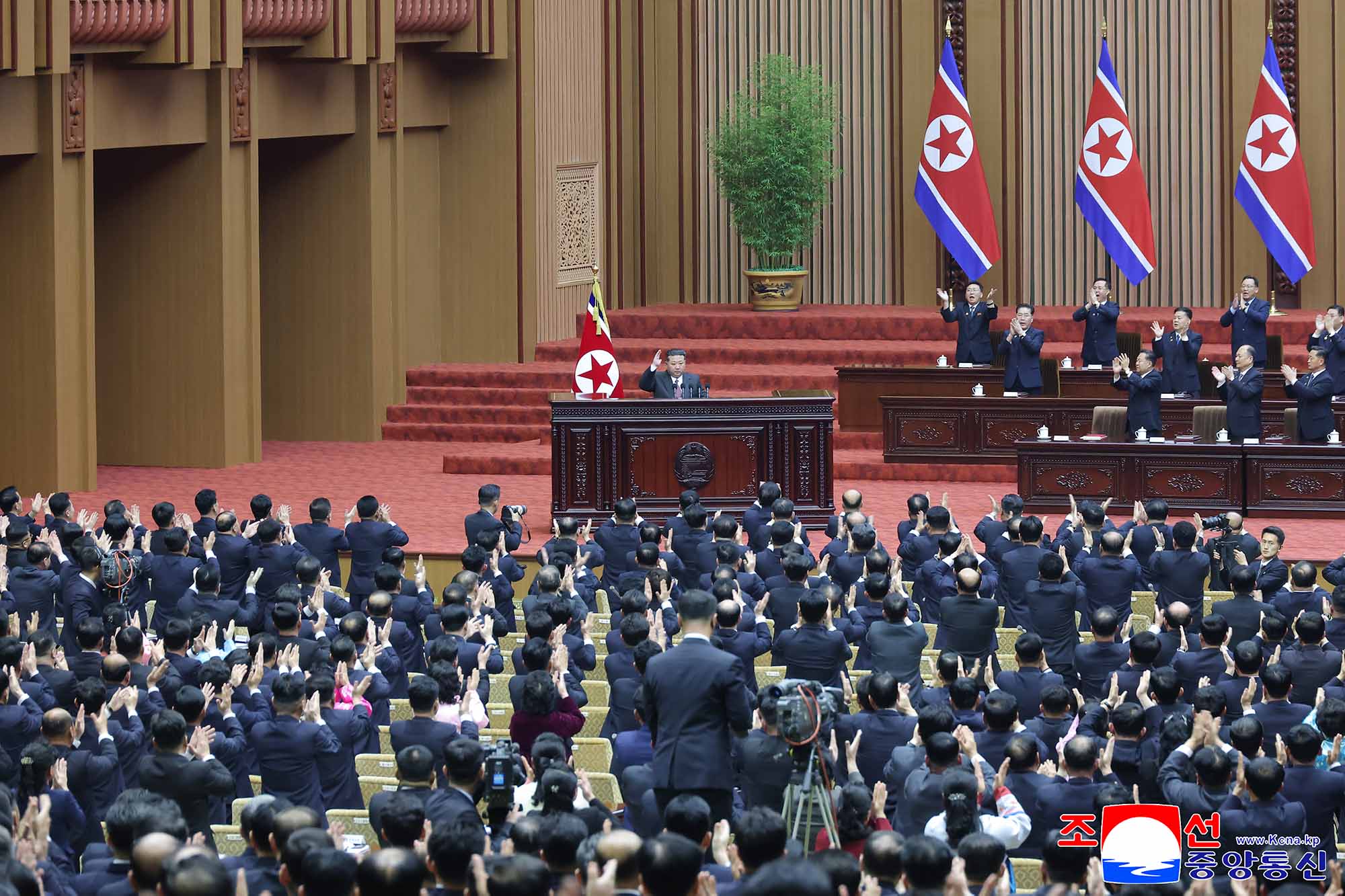 그이께서는 시정연설에서 우리식 사회주의위업은 새로운 단계에 들어섰으며 조선로동당의 령도밑에 지금의 발전형세를 더욱 확대공고화하여 국가의 부강번영과 인민의 복리증진을 촉진하는것은 공화국정부앞에 나서는 중대한 과업이라고 천명하시였습니다.
