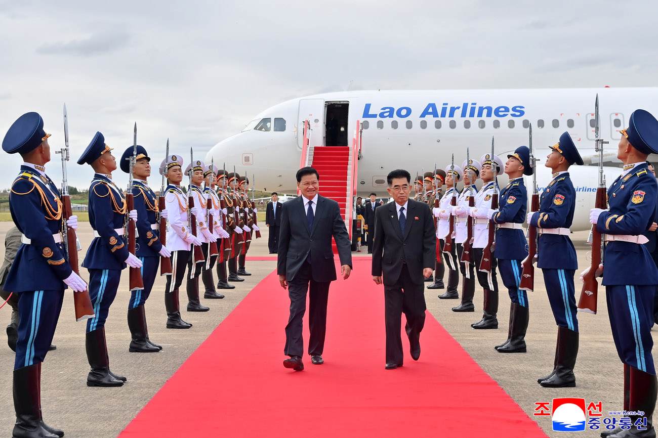 Thongloun Sisoulith, General Secretary of the Central Committee of the Lao People's Revolutionary Party and President of the Lao People's Democratic Republic, arrived in Pyongyang by his plane on the 7th to pay a congratulatory visit to the Democratic People's Republic of Korea on the occasion of the 80th founding anniversary of the Workers' Party of Korea at the invitation of Kim Jong Un , General Secretary of the WPK and President of the State Affairs of the DPRK.