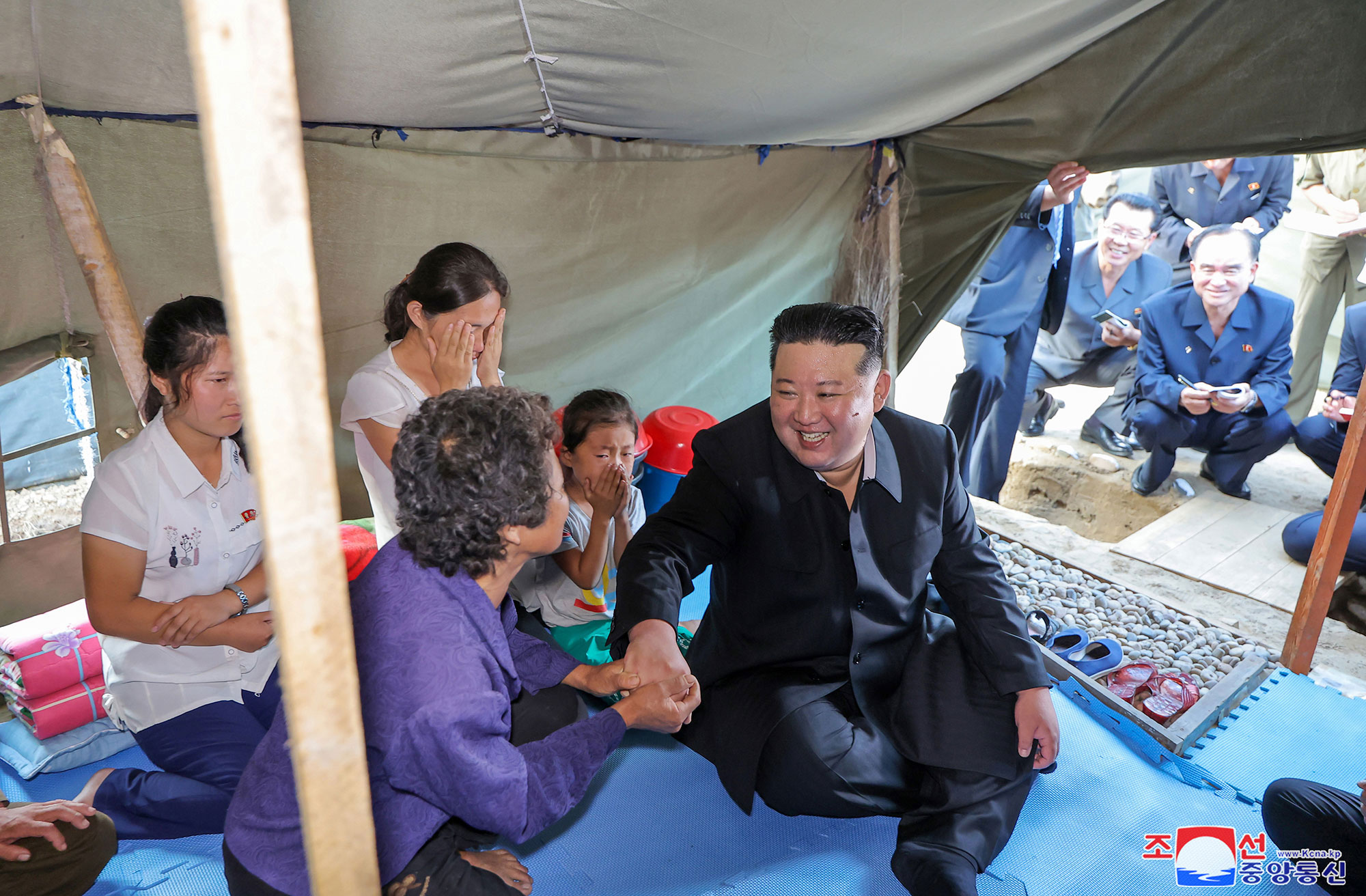 は、連日の大雨で被害を被ったピョンアン北道イジュ郡の水害被災民が臨時に居を定めたテントを訪れました。